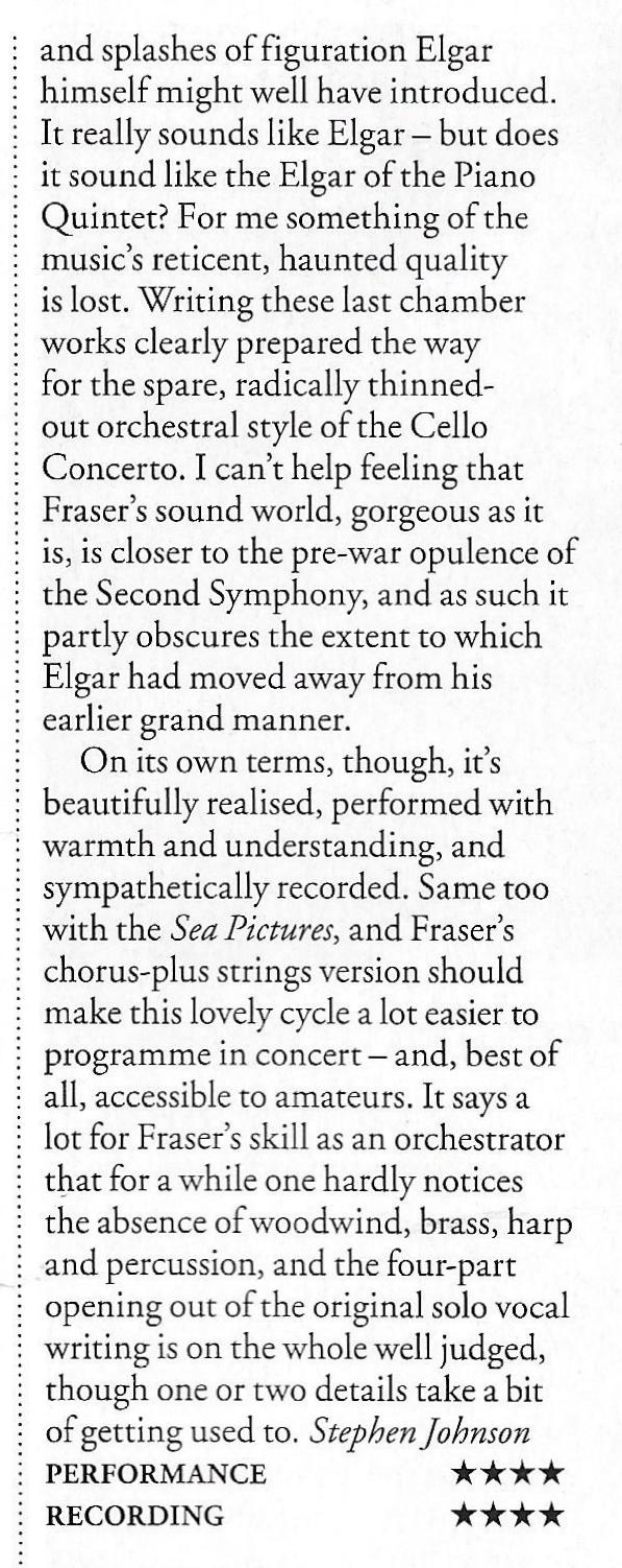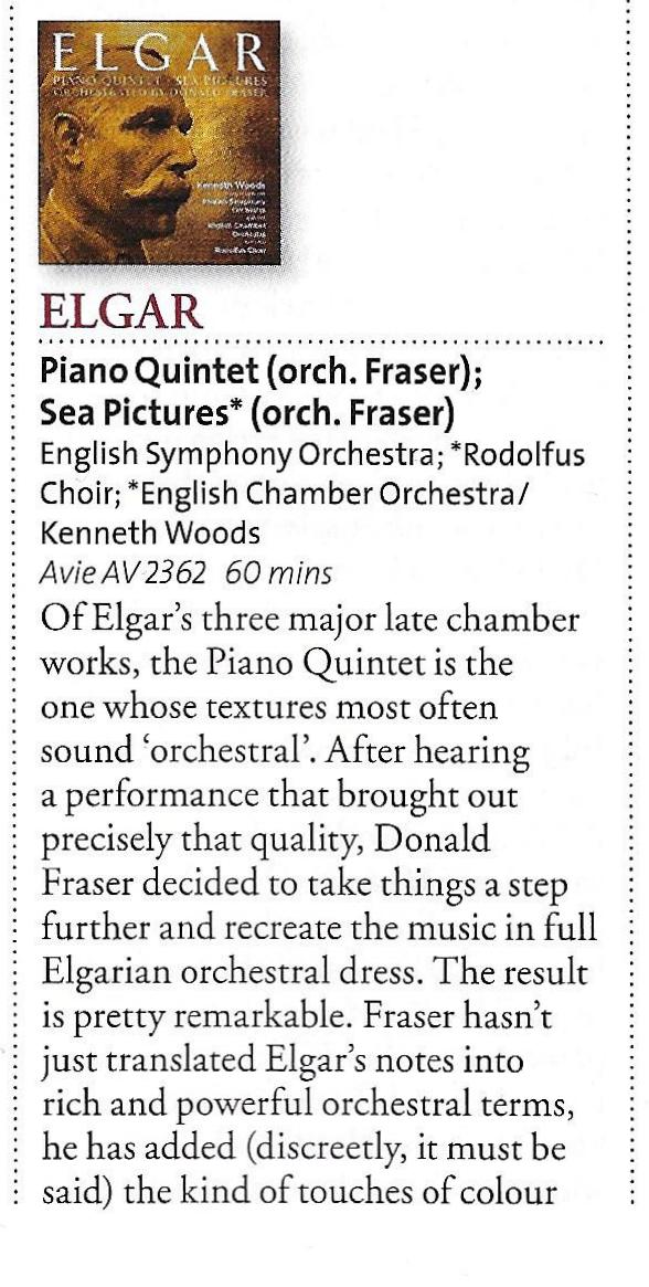 “These well-worked scores are triumphantly transcribed and orchestrated by British composer and conductor, Donald Fraser, and amplify the melancholic side of a composer often only celebrated for his more strident, nationalistic pieces.This is luscious icing on a musical cake and enriches Elgar’s impressive archetypal recipe. A thoroughly engaging use of the original memorable tunes and harmonies are here delivered by the full power of a symphony orchestra. Mellow strings and a chorale of throaty brass dominate, with a distinctive touch of harps, thunderous rolling timpani and emphatic cymbal crashes. Typically Elgarian.